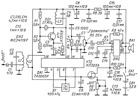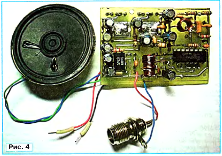 КП303А или КП303Б. Источником питания радиоприёмника служит NiCd аккумуляторная батарея напряжением 3,6 В и мкостью 600 мА.ч Перед первым включением приёмника следует проверить правильность монтажа. Налаживание приёмника сводится к настройке входноrо контура L1C2 и контура rетеродина L3C4. Это осуществляют, раздвиrая крайние витки катушек. Первым на- страивают контур rетеродина. Показателем ero точной настройки на частоту резонатора служит Maксимальное постоянное напряжение на резисторе R3. Для нaстройки входноro контура на ход приёмника необходимо подать сиrнал от reнepaтopa стaндартных сиrналов частотой 26,545 мrц и нaпряжением около 1 мкВ. Контролировать точную настройку вxoднoro контура можно по мак-симальному нaпряжению АРУ УПЧ на выводе 5 микросхемы DА 1 .
